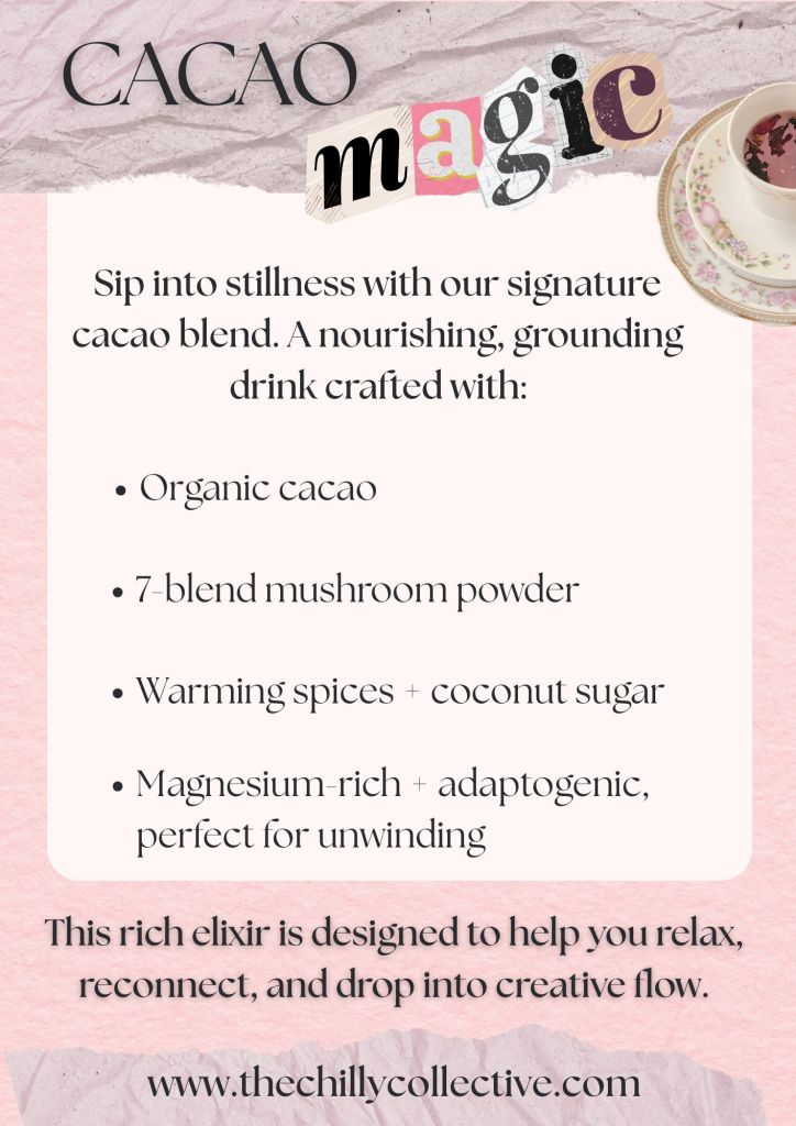Cacao & Collage is a guided workshop where nourishing drinks, quiet focus, and playful creativity come together. Cacao is a soul-soothing, adaptogenic drink designed to help your body unwind and your mind find its flow.